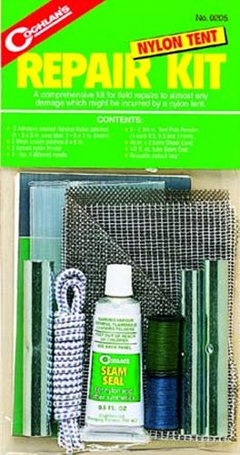 Coghlans Camping Nylon Tent Repair Kit Everything you need for repairs to yourNylon Tent.Contains: 2 adhesive-backed nylonpatches 2 mesh screen patches 2 spoolsnylon thread 1 #4 needle 3 ferrules 45”(114 cm) shock cord 1/2 fl. oz. (14.8 mL)Seam seal and a Ziplock bag for storage